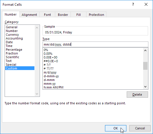 - Edit format like: mm/dd/yyyy, dddd