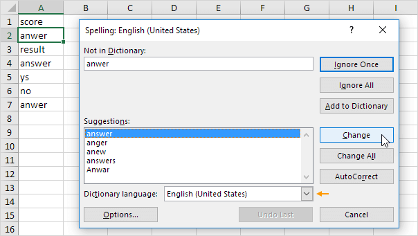 If a word is wrong in A2 and A7, Excel will correct both at once.
