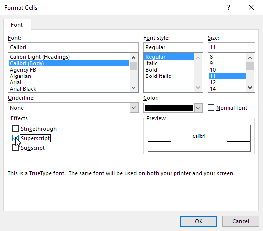 4. In the Font tab, check Superscript