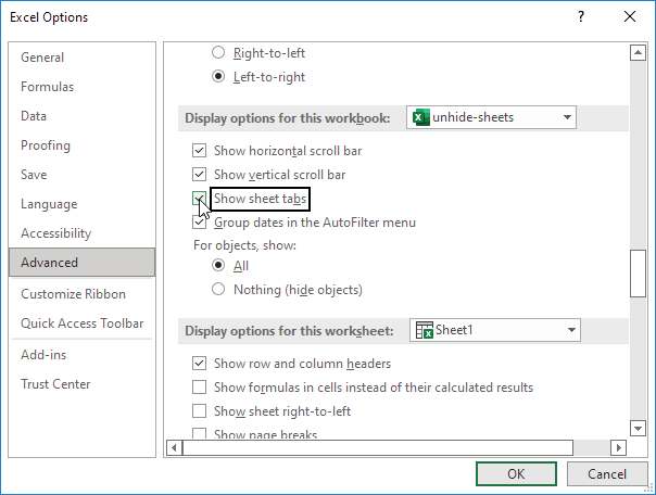 - Check Show sheet tabs.