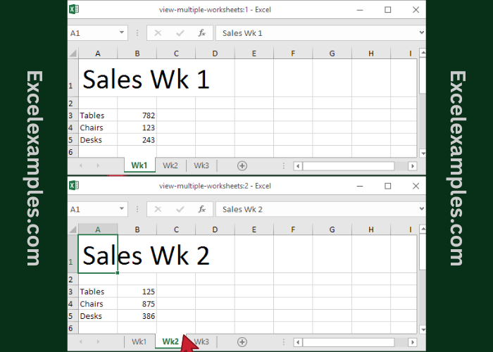 Now you can view both worksheets at the same time, making it easy to compare data (for example, sales in Week 1 vs Week 2).