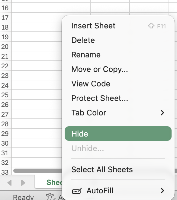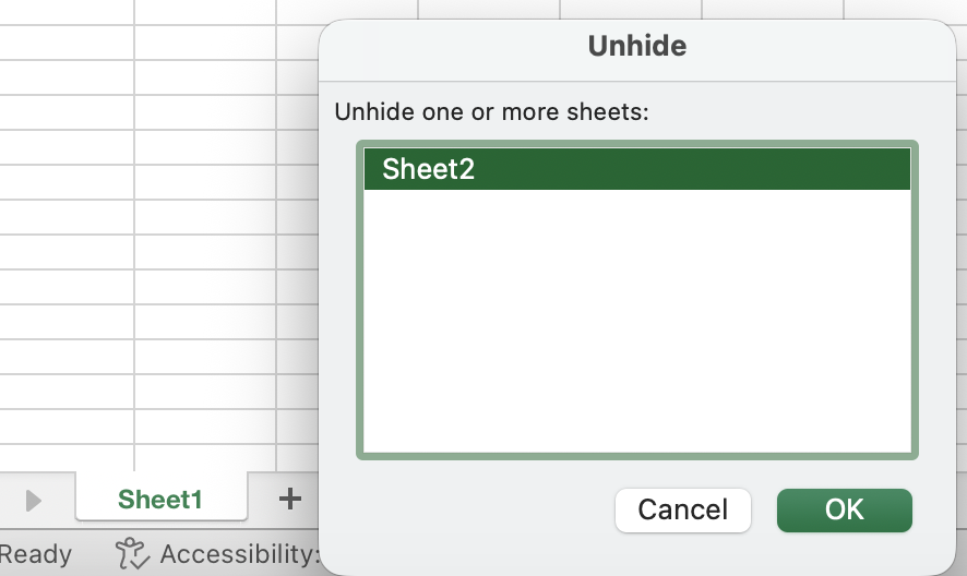 - Unhide: Right-click any tab → Unhide → Select sheet → OK