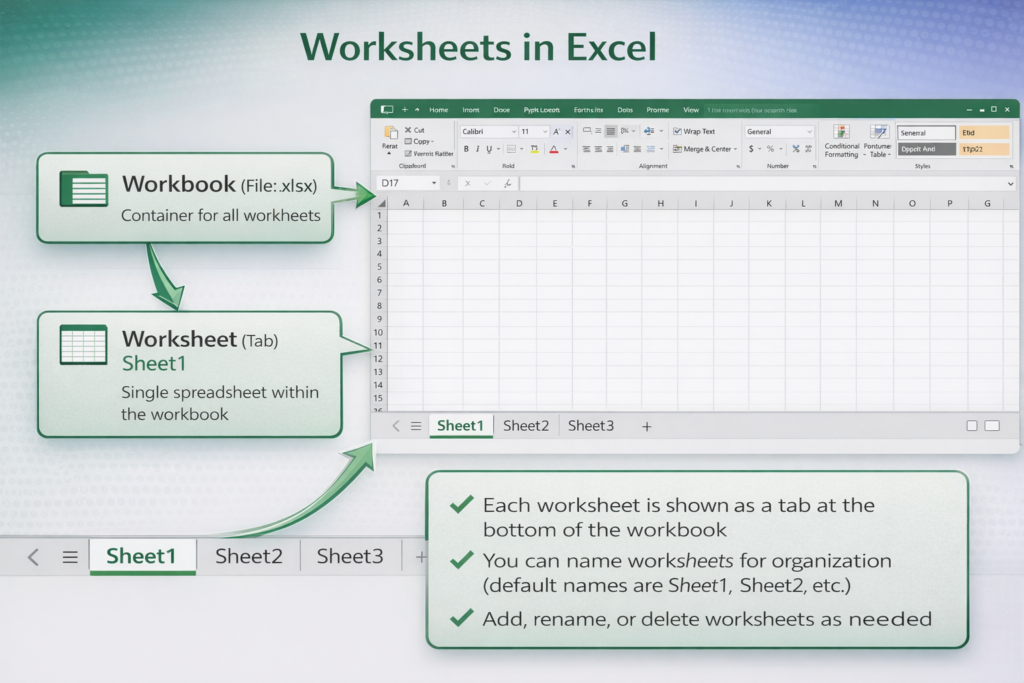 When you open a new workbook, Excel usually creates several worksheets automatically. These appear as tabs at the bottom of the Excel window, commonly named Sheet1, Sheet2, Sheet3.